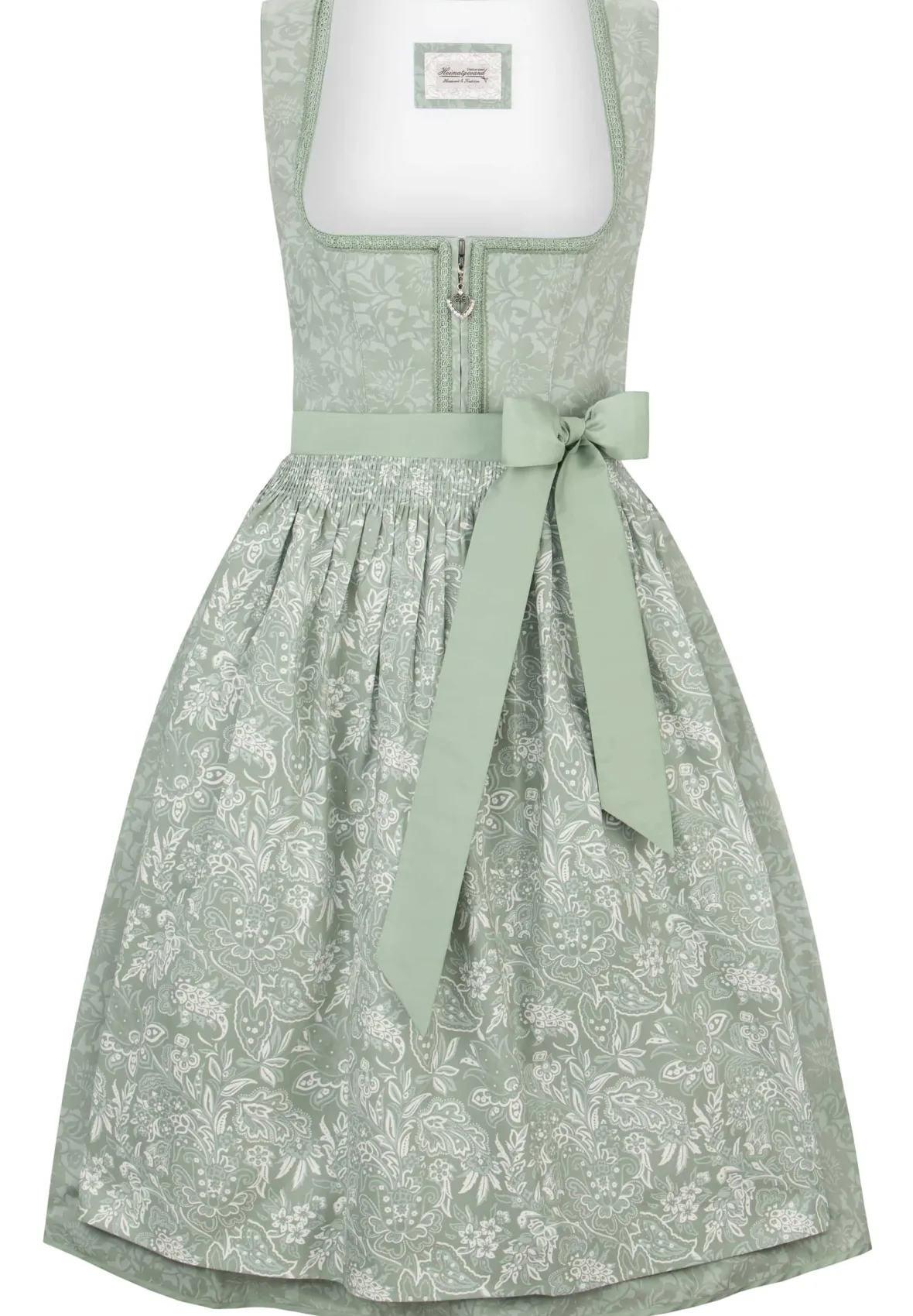 Dirndl Karoline von Heimatgwand. Das zeitlose Design besticht durch ein subtil gestaltetes Muster in angenehmer Baumwolle. Der gerade Ausschnitt ist mit eleganten Borten verziert und betont vorteilhaft das Dekolleté. Das traditionelle Mieder schließt unauffällig mit einem Reißverschluss, der mit einem femininen Herzanhänger versehen ist, und vollendet das Gesamtbild. Die modern, all-over bedruckte Schürze sorgt für das gewisse Extra. Ein unverzichtbares Must-have für jeden Liebhaber von Trachtenmode. Passend zur Variante in salbei: Dirndlbluse Daisy in creme. Passend zur Variante in beere: Dirndlbluse Laurene in creme.