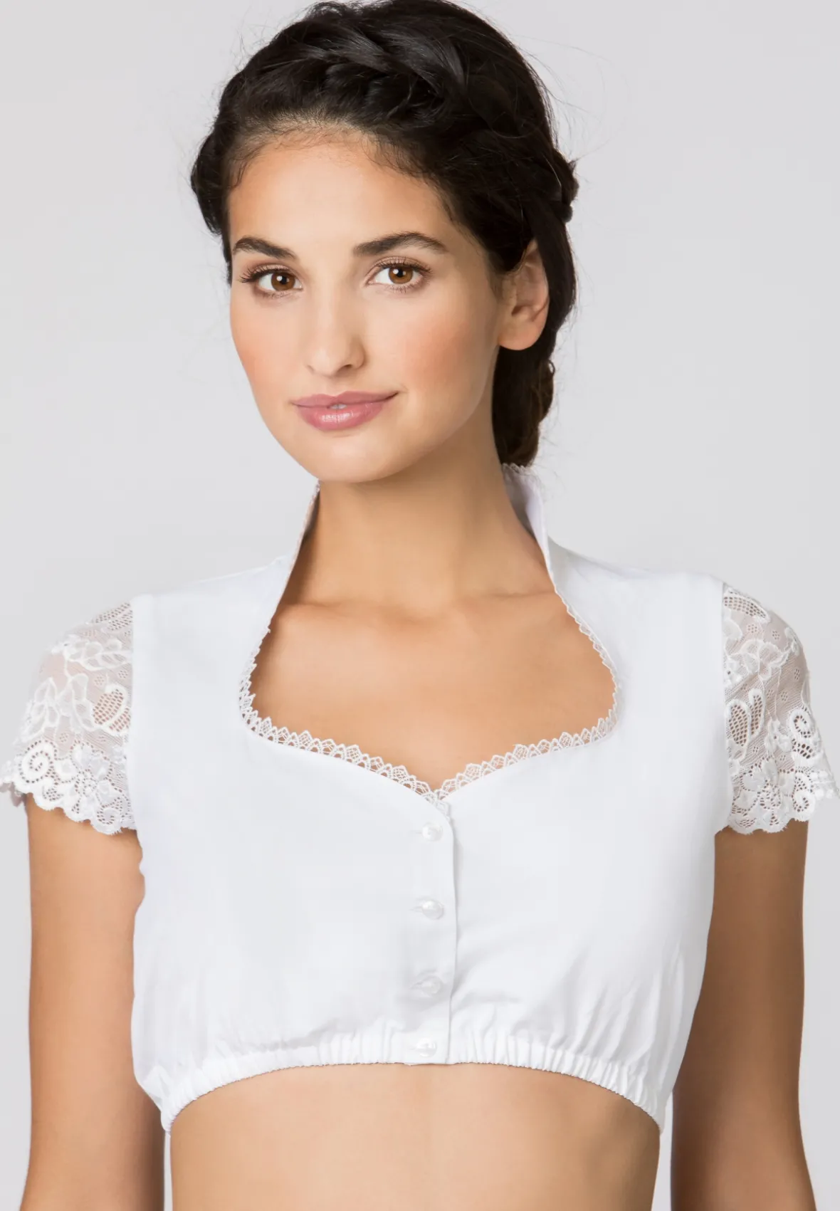 Dirndlbluse Livie von Stockerpoint in weiß. Die klassische Bluse überzeugt durch ihre hervorragende Passform. Der elegante Schalkragen ist mit einer feinen Spitze veredelt und umschmeichelt gekonnt das Dekolleté. Geschlossen wird die Damenbluse mit klassischen Knöpfen. Der edle Spitzenstoff am Ärmel sorgt für einen zusätzlichen Akzent und runden das Design perfekt ab.