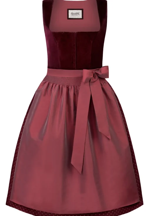 Dirndl Aurora von Heimatgwand in bordeaux. Das edle Modell überzeugt durch den exklusiven, hochwertigen Samt und ist mit liebevollen Details versehen. Der gerade Münchener Schnitt zaubert ein schönes Dekolleté. Das stilvolle Mieder wird dezent mit einem Reißverschluss geschlossen und rundet den gesamten Look ab. Die farblich abgestimmte Schürze und der Rock aus exquisitem Jacquard unterstreichen die feminine Passform. Ein absolutes Muss für jeden Trachtenfan. Kombipartner: Dirndlbluse Jessica in creme.