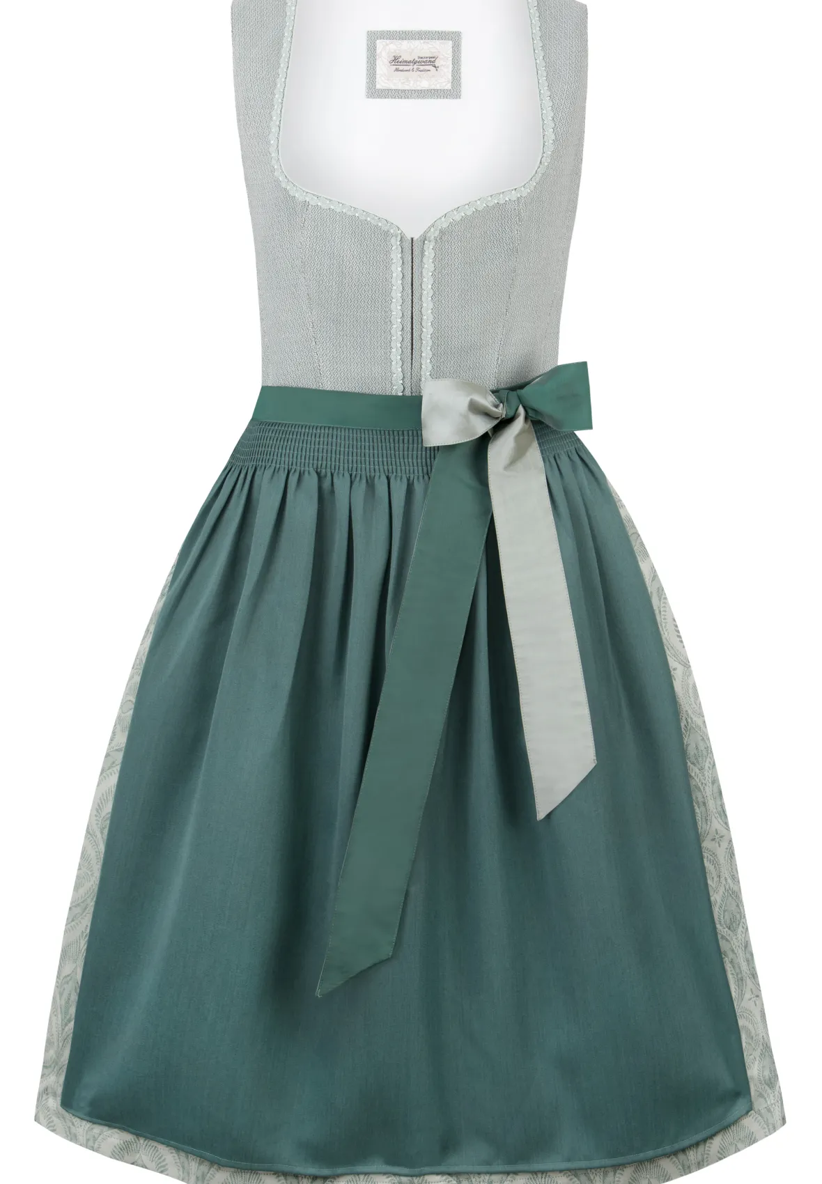 Dirndl Elisa von Heimatgwand in der Farbe salbei ist ein wahrer Blickfang! Sein schlichter Charme begeistert auf den ersten Blick. Hergestellt aus hochwertigem Jacquardstoff, wird dieses Dirndl perfekt durch eine harmonisch abgestimmte Schürze ergänzt, was dem Outfit einen femininen und hochwertigen Charakter verleiht. Das Mieder mit Herzausschnitt formt ein traumhaftes Dekolleté und wird dezent mit einem Reißverschluss geschlossen. Dieses Dirndl ist ein absolutes Must-have für die stilbewusste Trachtenliebhaberin. Unser Model trägt dazu die Dirndlbluse Smilla in creme.