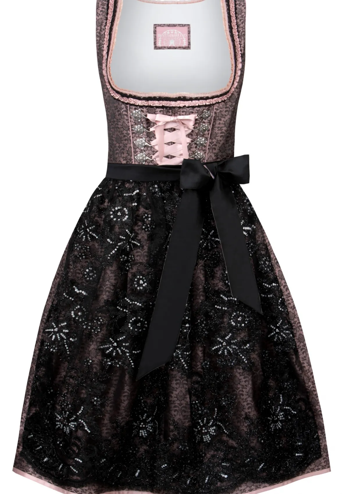 Dirndl Finja für Damen von Wiesnwuid in altrosa. Das edle Dirndl begeistert durch das trendige Jacquard Muster und der passenden Spitzenschürze. Für die feminine Note sorgen die eingearbeiteten Rüschen am Rundausschnitt, die aufgenähten Zierborten sowie die verzierten Miederhaken in altsilber. Durch das zweifarbige Schürzenband entsteht der besondere Look. Die Schnürung aus einem passenden Satinband unterstreicht das edle Design. Ein absolutes Highlight für jede Dirndlträgerin. Kombipartner: Trachtenbody Romy in schwarz.