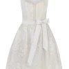 Das Dirndl Josefina von Bergfeuer Couture in creme besticht durch seinen exklusiven Charme. Hergestellt aus hochwertigem Trachtenstoff, beeindruckt das Kleidungsstück im Oberteil mit einem erhabenen Blumenrelief sowie einer festlichen Borte. Der Schalkragen mit Rundausschnitt verleiht einen Hauch von Femininität und zaubert ein traumhaftes Dekolleté. Der elegant gefaltete Rock mit einer praktischen Schubtasche fällt fließend und wird durch eine farblich abgestimmte Spitzenschürze perfekt ergänzt. Ein absolutes Must-Have für jede moderne Braut. Unser Model kombiniert dazu die Dirndlbluse Smilla in Creme, um den Look abzurunden.