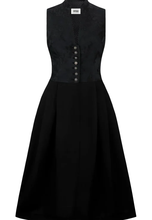 Dirndl Lauryin ohne Schürze für Damen von Heimatgwand in schwarz. Das klassische Dirndl aus hochwertigem Allover Jacquard besticht mit vielen liebevollen Details. Der traditionelle V-Ausschnitt mit Stehkragen und ist mit trachtigen Zierborten veredelt. Die typischen Trachtenknöpfe am Mieder sind das Markenzeichen dieses Modells. Der Rock ist aus pflegeleichten Mechanik Stretch. Der ideale Kombipartner für alle modernen und traditionellen Schürzen Dazu passen die Schürzenmodellen SC-300, Claire, Kristin, Molina und Corinna. Unser Model trägt die Bluse B-1060 in weiß. Bluse und Schürze sind nicht im Lieferumfang enthalten.
