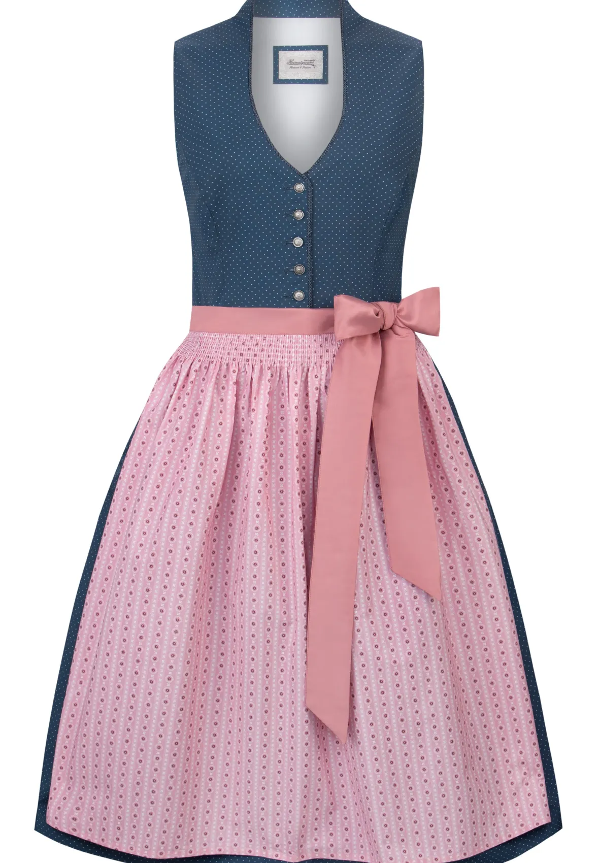 Dirndl Marina für Damen von Heimatgwand in blau. Das stilvolle Modell begeistert durch den trendigen Schalkragen mit Rundausschnitt und schafft ein traumhaftes Dekolleté. Klassisch zurückhaltend und trotzdem edel, so verzaubert das Dirndl aus pflegeleichter Baumwolle in floralem Allover. Das edle Mieder mit Zierborte wird durch exklusive Knöpfe verziert. Die farblich abgestimmte Schürze unterstreicht die feminine Passform. Kombipartner: Dirndlbluse B-5070 in der Farbe weiß.