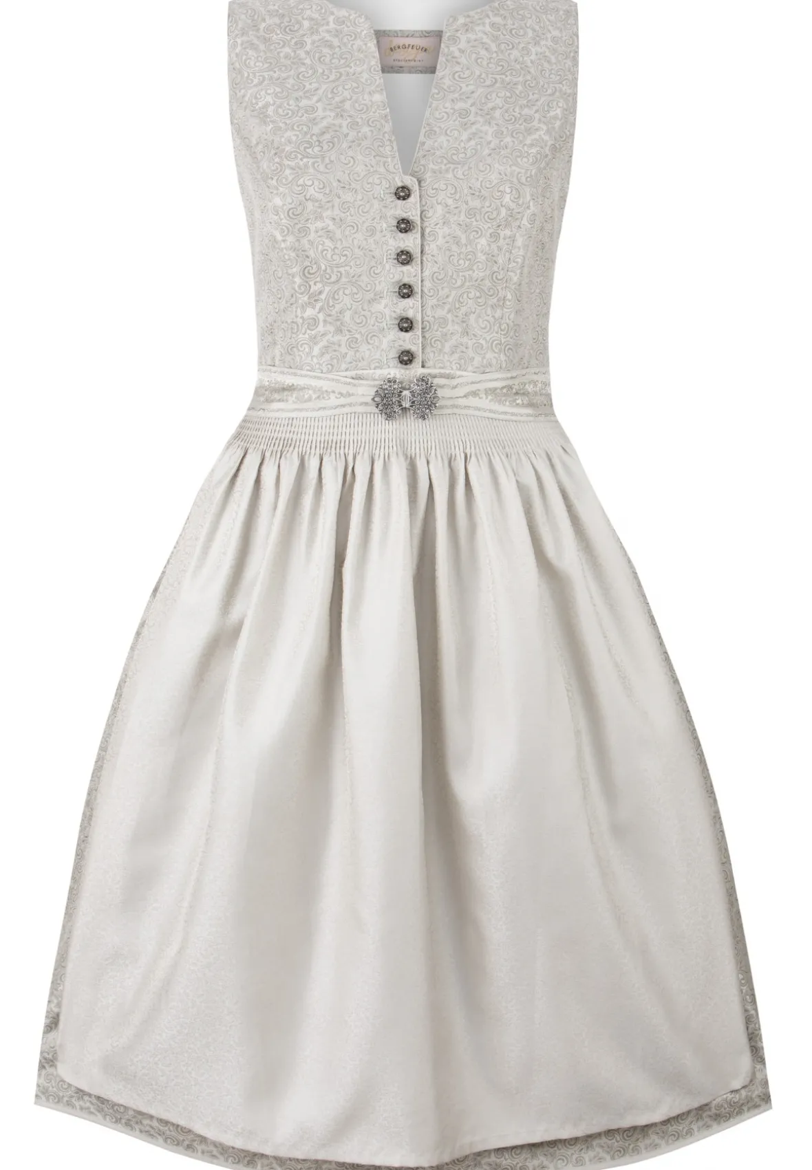 Dirndl Nora von Bergfeuer in creme. Mit exklusivem Jacquard Muster versehen, verzaubert das edle Dirndl mit zahlreichen, liebevollen Details. Das hochgeschlossene Mieder mit einem schlichten V-Ausschnitt überzeugt durch seine pure Eleganz. Die edlen Zierknöpfe verfeinern das gesamte Erscheinungsbild. Das ausgefallene Schürzenband und die traditionelle Schließe setzen die Jacquard Schürze gekonnt Szene. Unser Model trägt die passende Bluse Jessica in der Farbe creme.