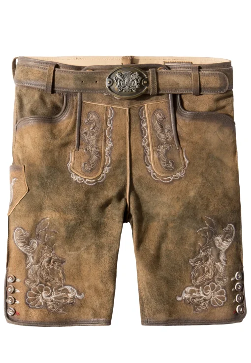 Trachtenlederhose Hans von Stockerpoint Classics. Die kurze Lederhose aus hochwertig gegerbten Wildbock Leder in Hirschoptik ist in Design und Qualität auf Zeitlosigkeit und Langlebigkeit ausgelegt. Das exklusive Modell in den verschiedenen traditionellen Farben ist mit Hirschmotiven und Ranken bestickt. Dieses hochwertige Modell ist liebevoll und mit viel Herzblut von Hand gespeckt, damit der angesagte Vintage Look garantiert ist. Die Trachtenhose wird mit einem Gürtel und zweifarbiger Schließe geliefert. Sie ist ein ständiger Begleiter und idealer Kombipartner für dein modernes Trachtenoutfit.