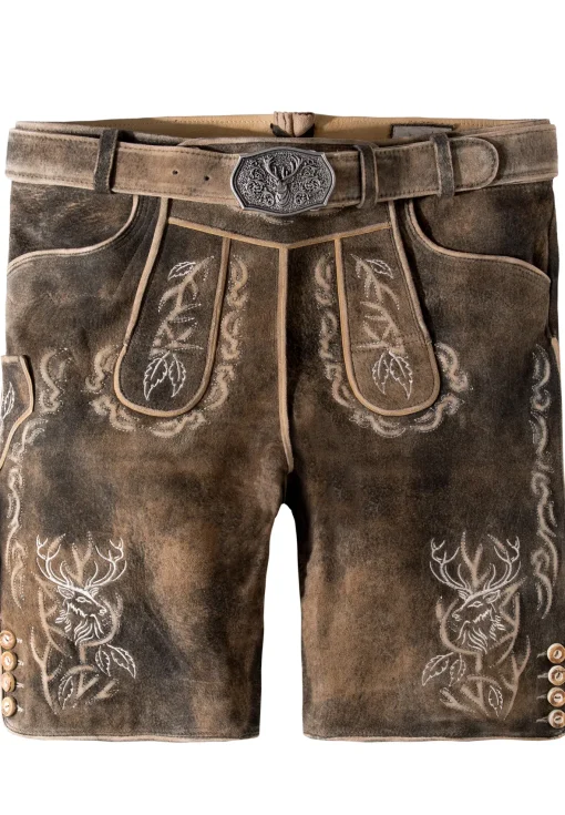 Trachtenlederhose Lee von Stockerpoint Classics. Diese kurze Lederhose aus hochwertig gegerbtem Wildbockleder in Hirschoptik besticht durch ihren einzigartigen Antik-Look und zählt zu unseren Favoriten. Die stilvolle Verzierung mit einem edlen Hirschmotiv und aufwendiger Reliefstickerei ist markant und hochwertig. Die außergewöhnliche Struktur des Leders mit antiken Farbverläufen verleiht dem Modell eine ganz besondere Note und macht es zu einem Unikat. Die Trachtenlederhose wird mit einem passenden Gürtel incl. Schließe geliefert.