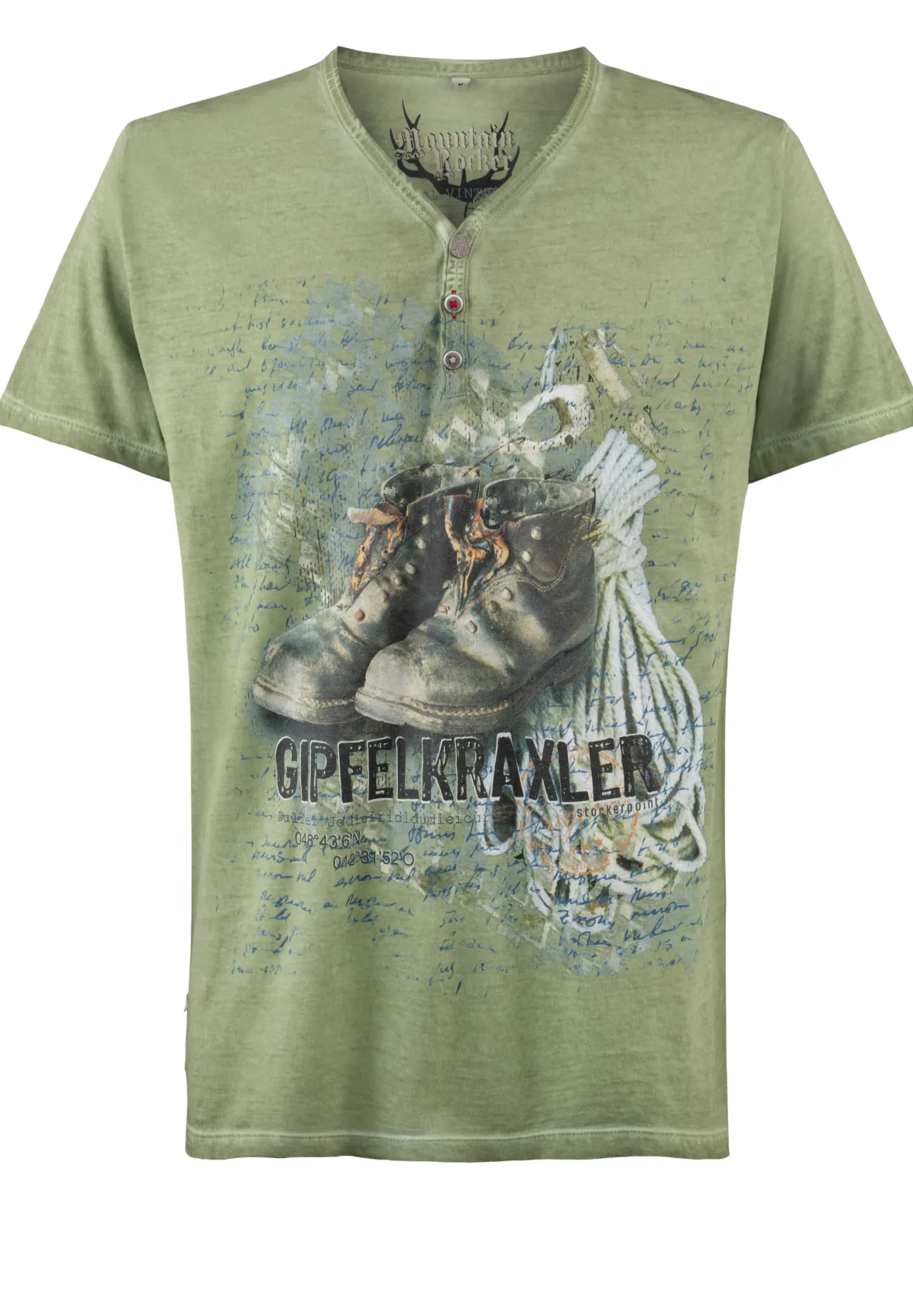 T-Shirt Gipfelkraxler von Mountain Rocker. Das im „Comfort-Fit“ geschnittene Trachtenshirt aus der „Wiesn Rider“ Kollektion“ in hochwertiger Baumwoll-Qualität überzeugt durch den angesagten Print mit dem Schriftzug „Gipfelkraxler“. Für die coole Optik sorgt die trendige „Used washed Optik“ und setzt das stylische Designmotiv perfekt in Szene. Der V-Ausschnitt mit Knopfleiste ist mit passend abgestimmten Knöpfen verziert und sorgt zusätzlich für den einzigartigen Look. Das Shirt lässt sich lässig zu Lederhose und zur Jeans tragen und ist ein unverzichtbares Statement für coole Typen.