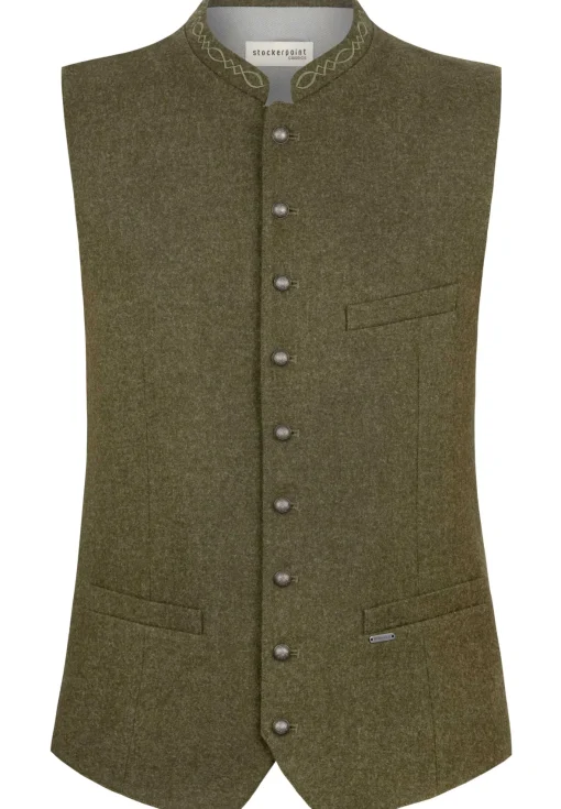 Trachtenweste Devito von Stockerpoint Classics. Die traditionelle Weste ist aus einer hochwertigen melierten Lodenqualität gefertigt. Die klassische, gerade Schnittführung garantiert eine sehr gute Passform und einen angenehmen Tragekomfort. Harmonisch abgestimmter, bestickter Stehkragen und Paspel unterstreichen das besondere Design. Der Rücken ist aus einem exklusiven, schwarzen Baumwollstoff gefertigt und lässt sich mit einem Riegel verstellen. Kugelknöpfe in altsilber runden das edle Erscheinungsbild gekonnt ab. Die Trachtenweste ist der ideale Kombipartner zu unseren Lederhosen und Trachtenwesten und prägen den klassischen Trachtenlook.