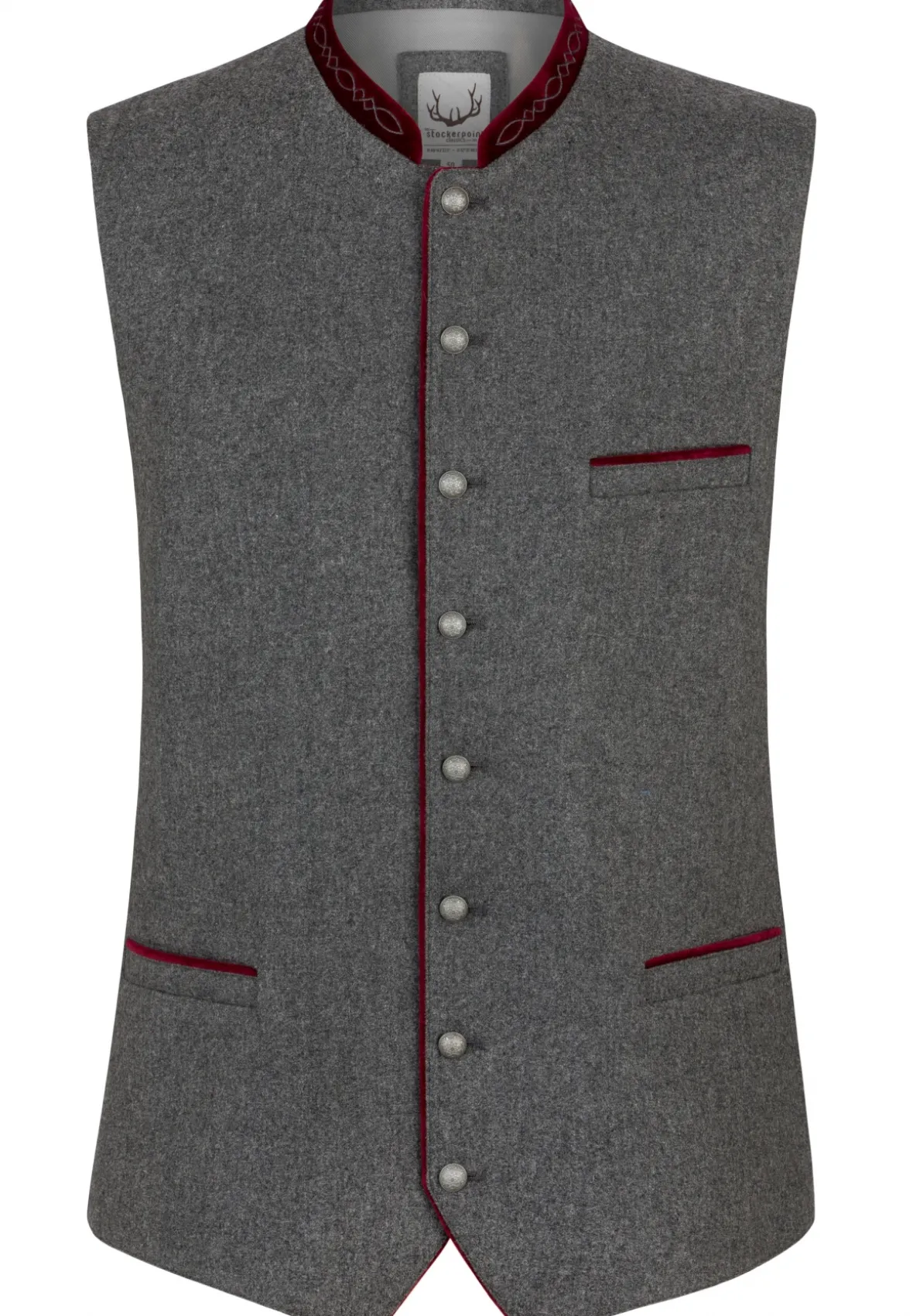 Trachtenweste Fabricio von Stockerpoint Classics. Die klassische Weste aus hochwertigem, melierten Lodenstoff ist der Klassiker unter den Trachtenwesten. Der Stehkragen ist aus feinem Baumwollsamt mit einer traditionellen Stickerei dezent bestickt und prägt den unverwechselbaren Stil. Farblich abgestimmte Paspel unterstreichen das traditionelle Design. Die klassische, gerade Schnittführung garantiert eine sehr gute Passform und einen angenehmen Tragekomfort. Der Rücken ist aus einem exklusiven, schwarz gestreiften Satinstoff gefertigt und lässt sich mit einem Riegel verstellen. Geprägte Kugelknöpfe aus altsilber runden das edle Erscheinungsbild gekonnt ab. Die Trachtenweste ist der ideale Kombipartner zu unseren traditionellen Trachtenhemden und Lederhosen.