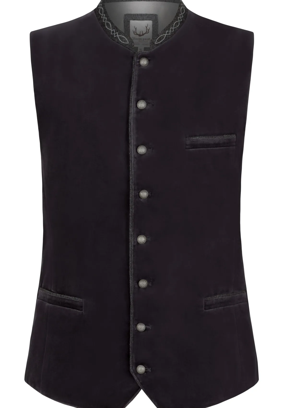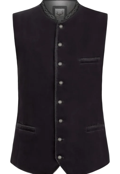 Trachtenweste Lorenzo von Stockerpoint Classics. Die klassische Weste aus hochwertigem Baumwollsamt ist der Klassiker unter den Trachtenwesten. Der Stehkragen ist aus hochwertigem, dezent bestickten Lodenstoff gearbeitet und prägt den unverwechselbaren Stil. Farblich abgestimmte Paspel unterstreichen das traditionelle Design. Die klassische, gerade Schnittführung garantiert eine sehr gute Passform und einen angenehmen Tragekomfort. Der Rücken ist aus einem exklusiven, schwarz gestreiften Jacquardstoff gefertigt und lässt sich mit einem Riegel verstellen. Geprägte Kugelknöpfe aus altsilber runden das edle Erscheinungsbild gekonnt ab. Die Trachtenweste ist der ideale Kombipartner zu unseren traditionellen Trachtenhemden und Lederhosen. Alles neu und doch ein Stück Heimat.