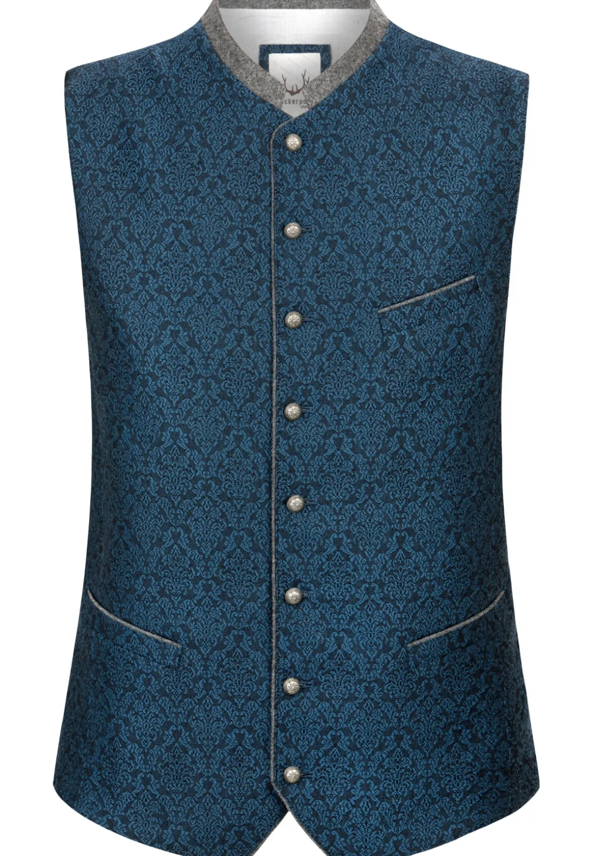 Trachtenweste Marino von Stockerpoint Classics. Die traditionelle Weste aus hochwertig gewebten Strukturstoff ist der Klassiker unter den Trachtenwesten. Der Stehkragen und die farblich abgestimmten Paspel sind aus meliertem Lodenstoff und prägen den unverwechselbaren Stil. Die klassische, gerade Schnittführung garantiert eine sehr gute Passform und einen angenehmen Tragekomfort. Der Rücken ist aus einem exklusiven, schwarzen Baumwollstoff gefertigt und lässt sich mit einem Riegel verstellen. Geprägte Kugelknöpfe in altsilber runden das edle Erscheinungsbild gekonnt ab. Die Trachtenweste ist der ideale Kombipartner zu unseren Lederhosen und Trachtensakkos und prägen den klassischen Trachtenlook.